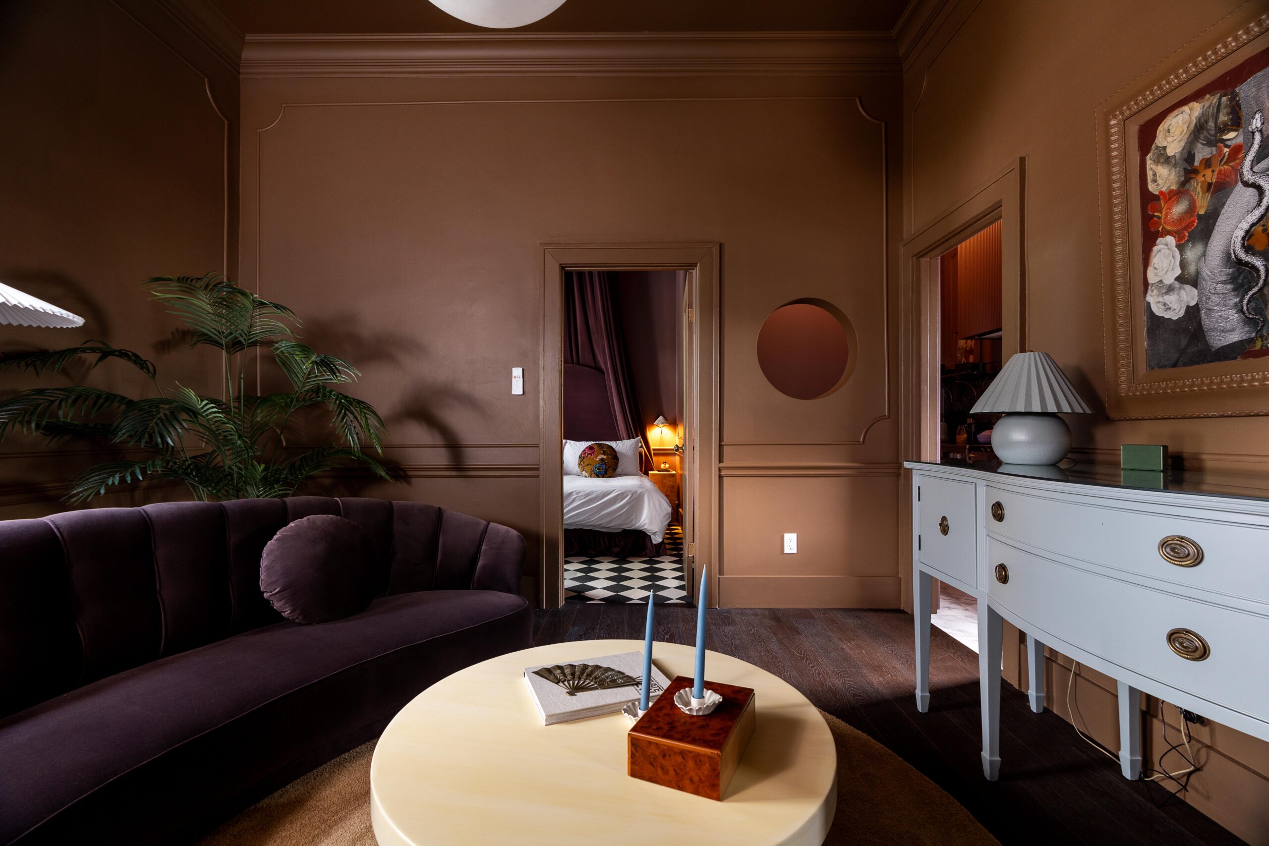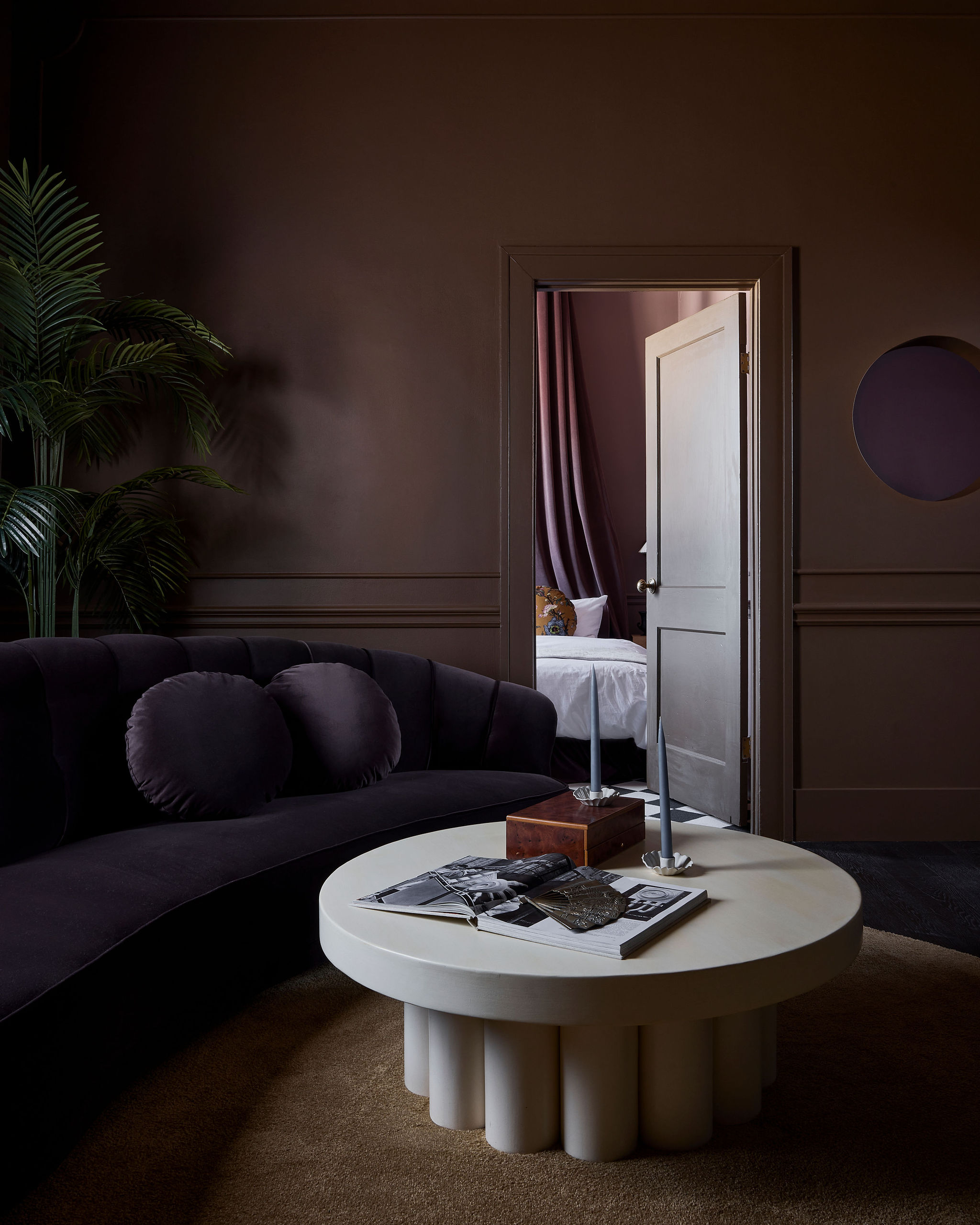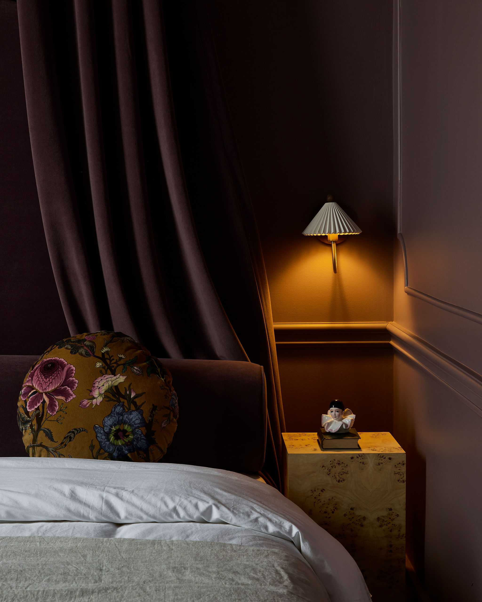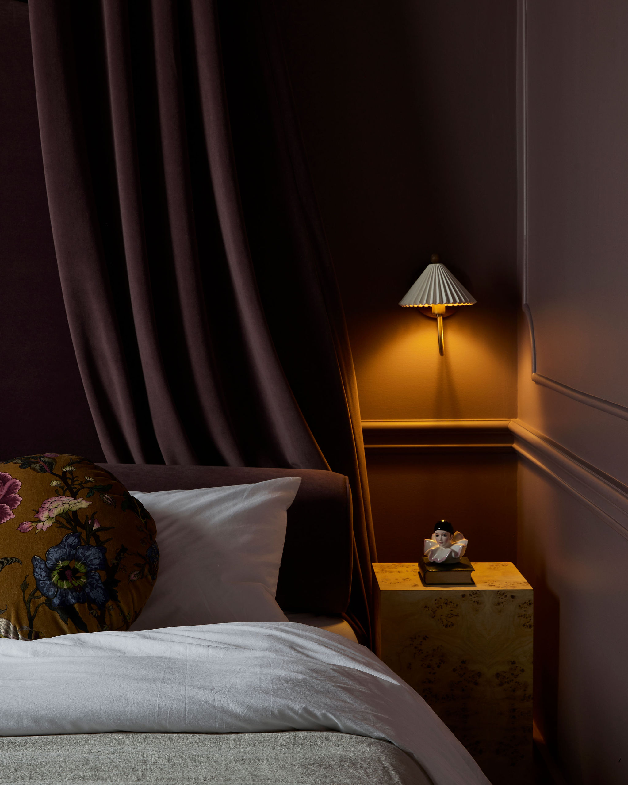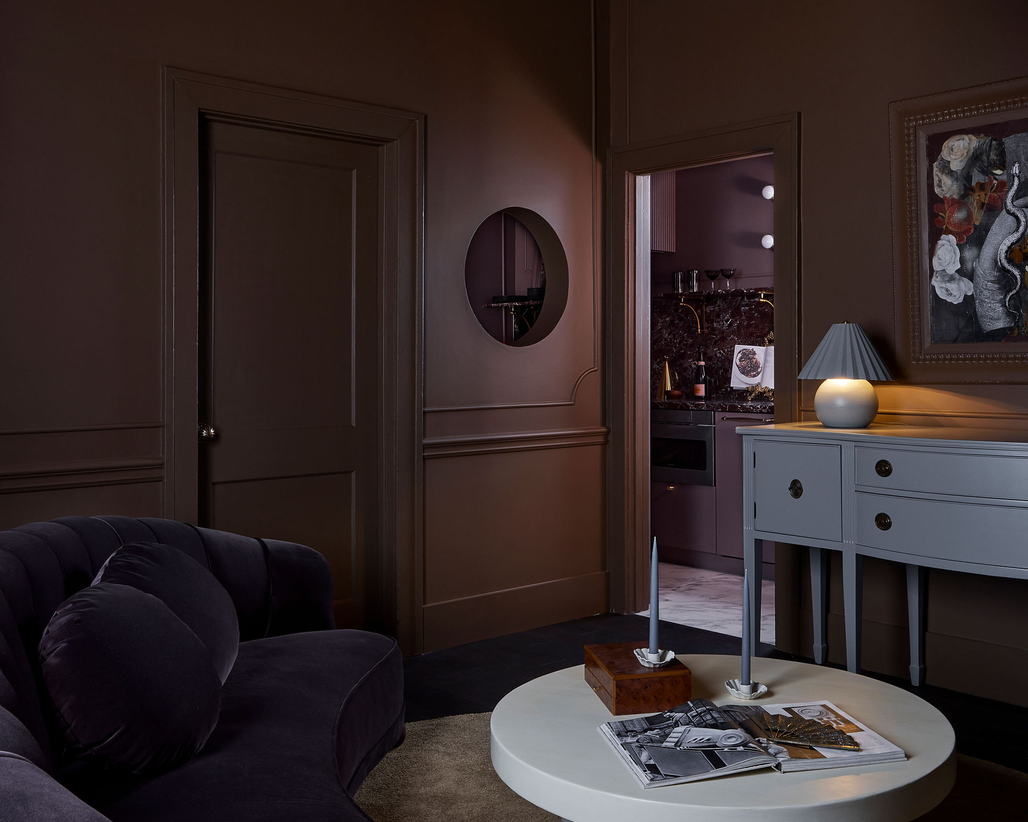 Indulge in the opulence of our romantic, chocolate-brown suite with moody purple undertones at Hotel Julie’s Flat 03.