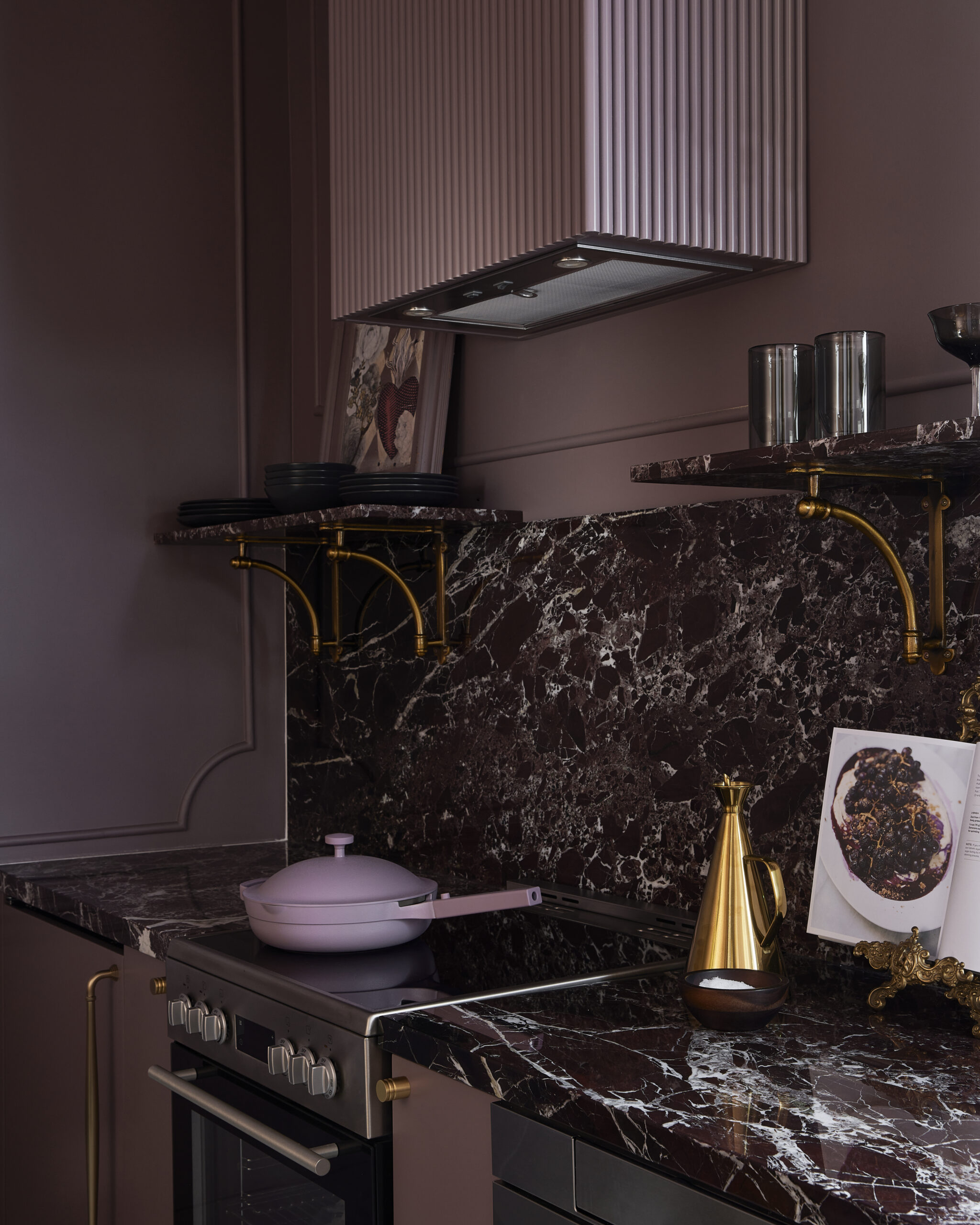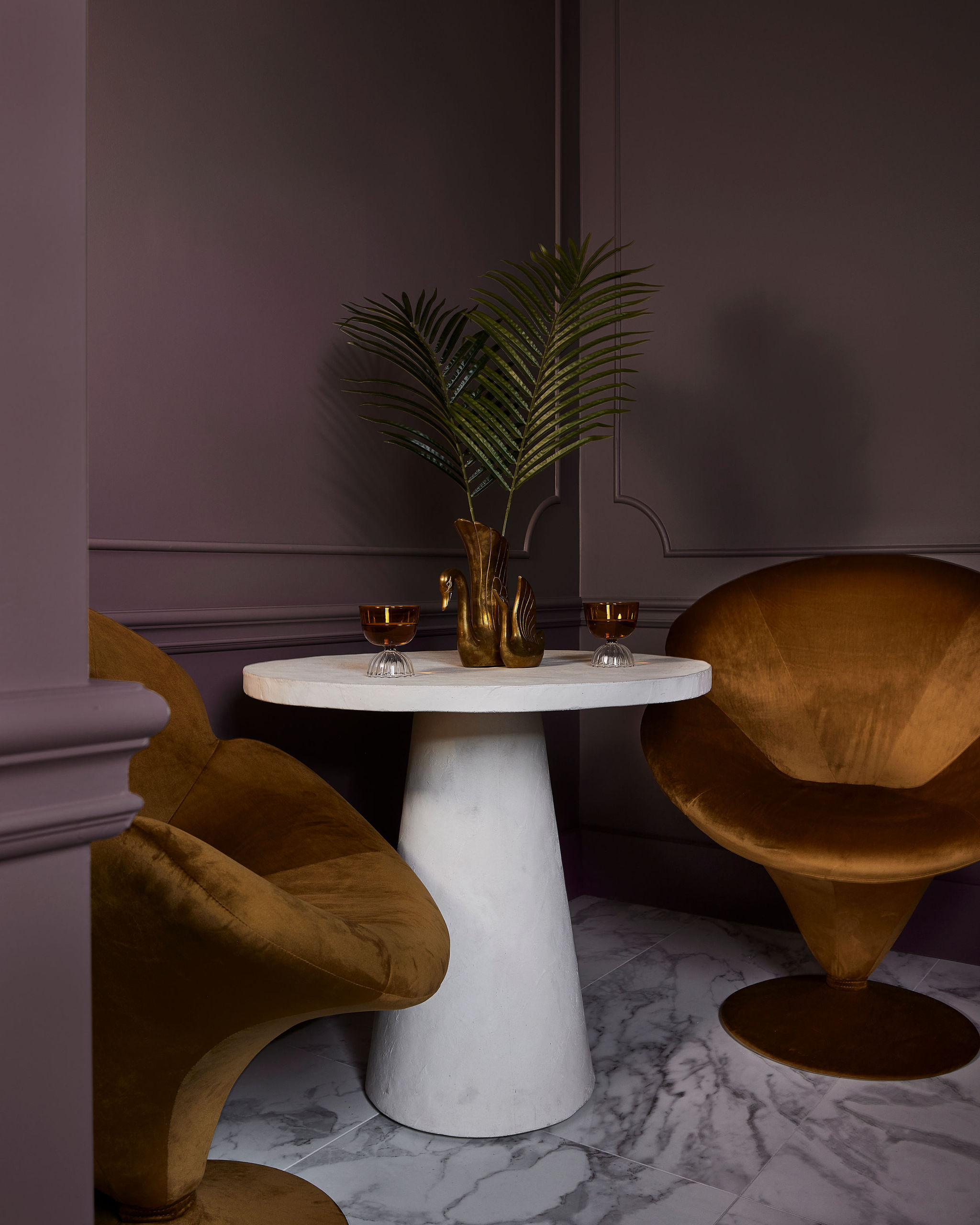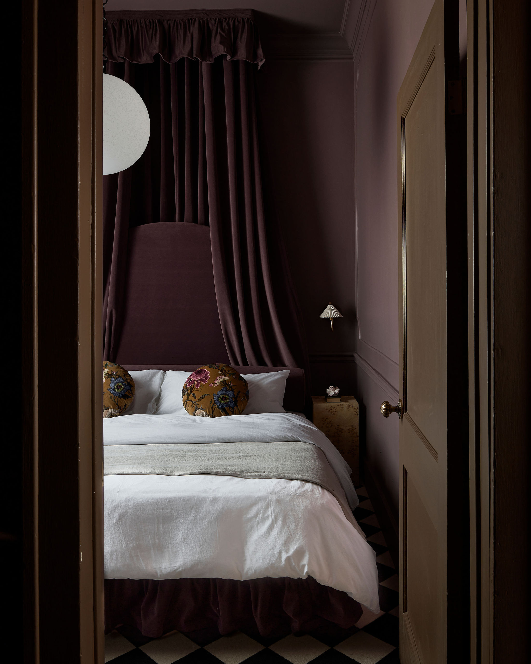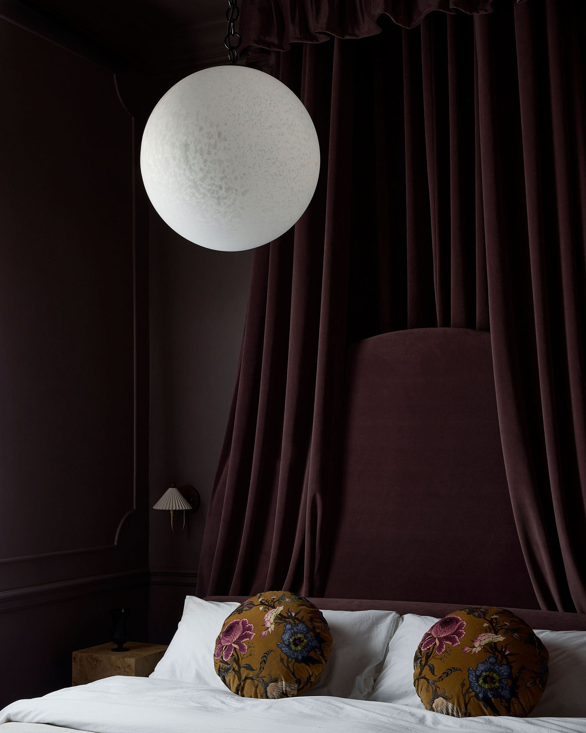 Indulge in the opulence of our romantic, chocolate-brown suite with moody purple undertones at Hotel Julie’s Flat 03.