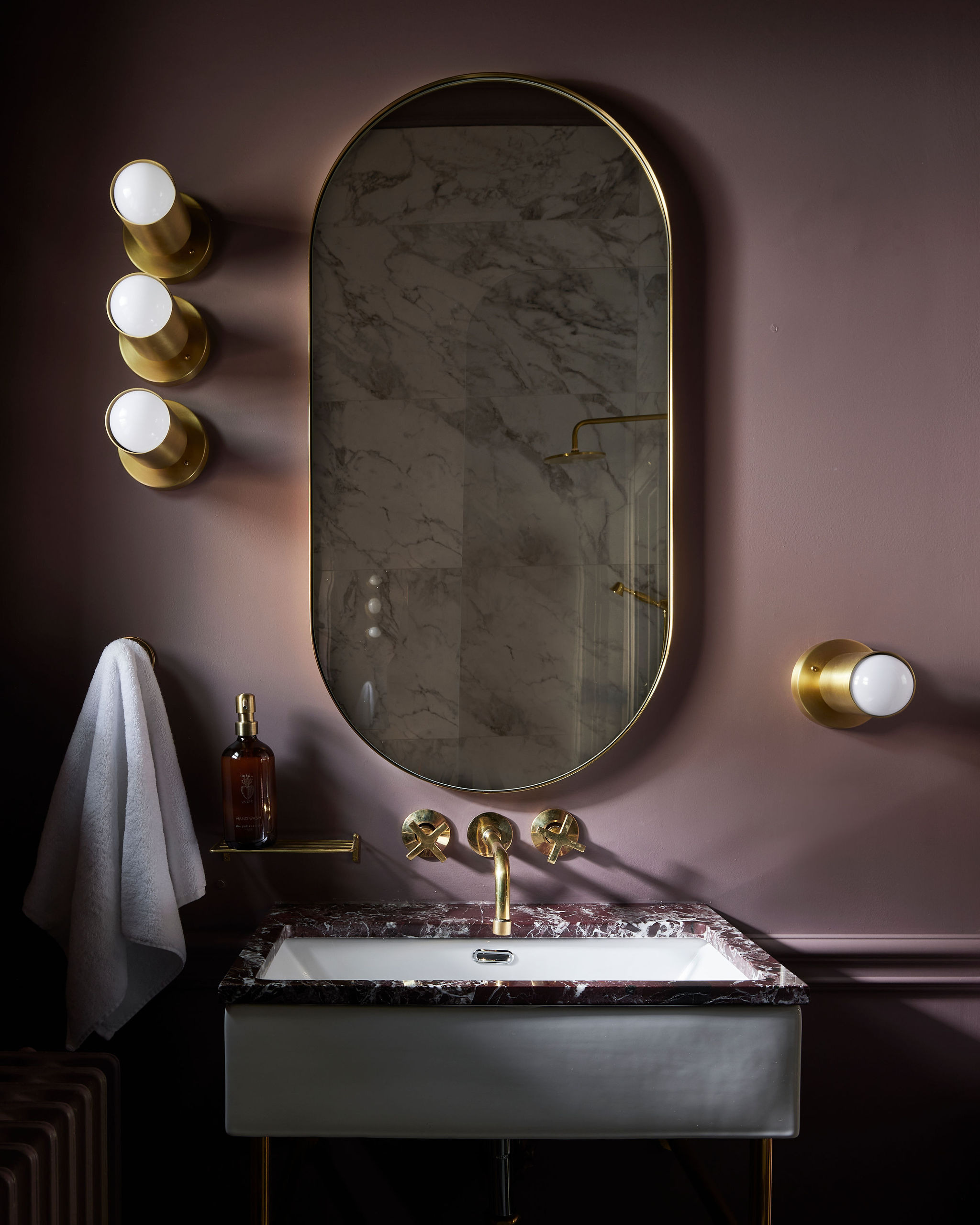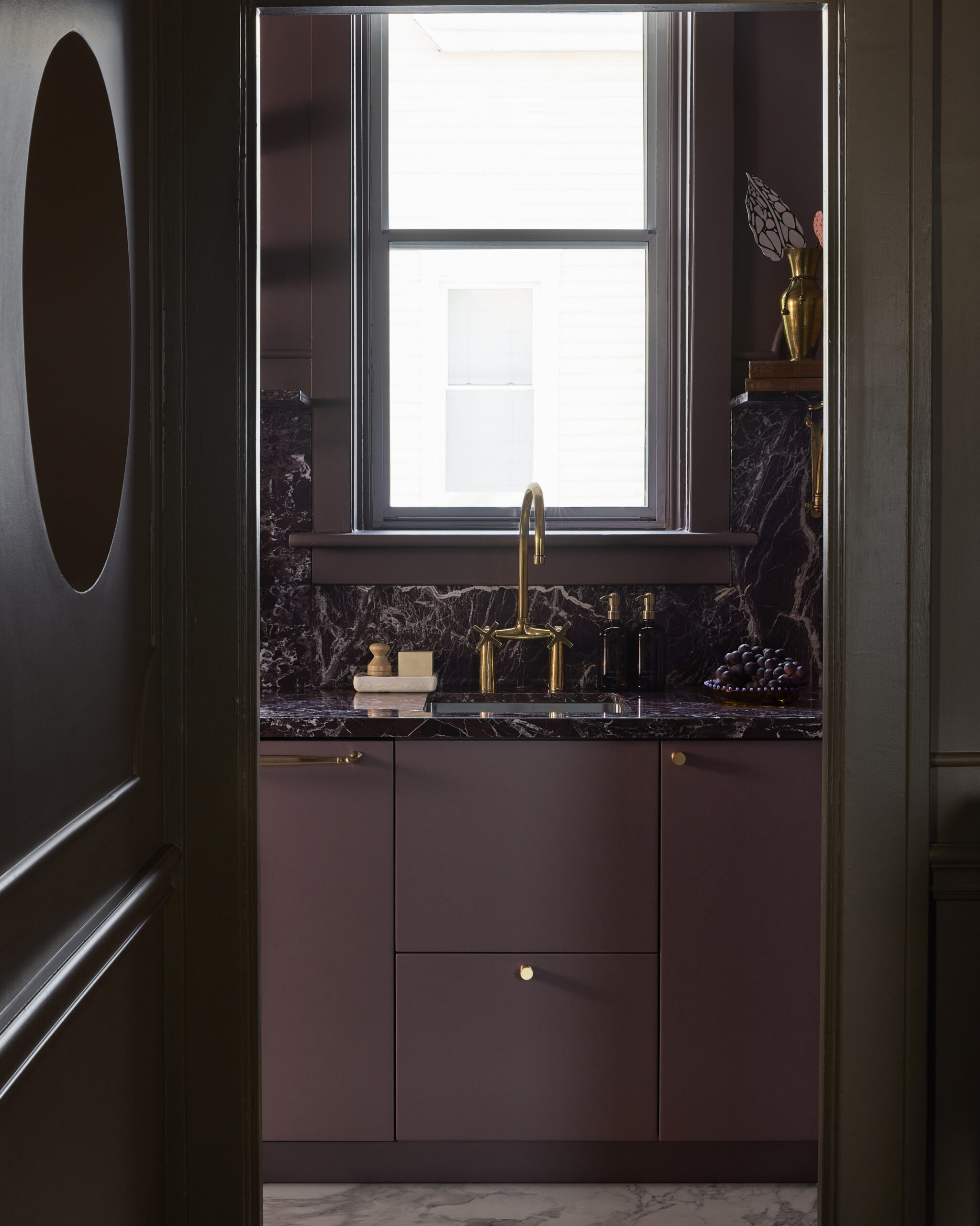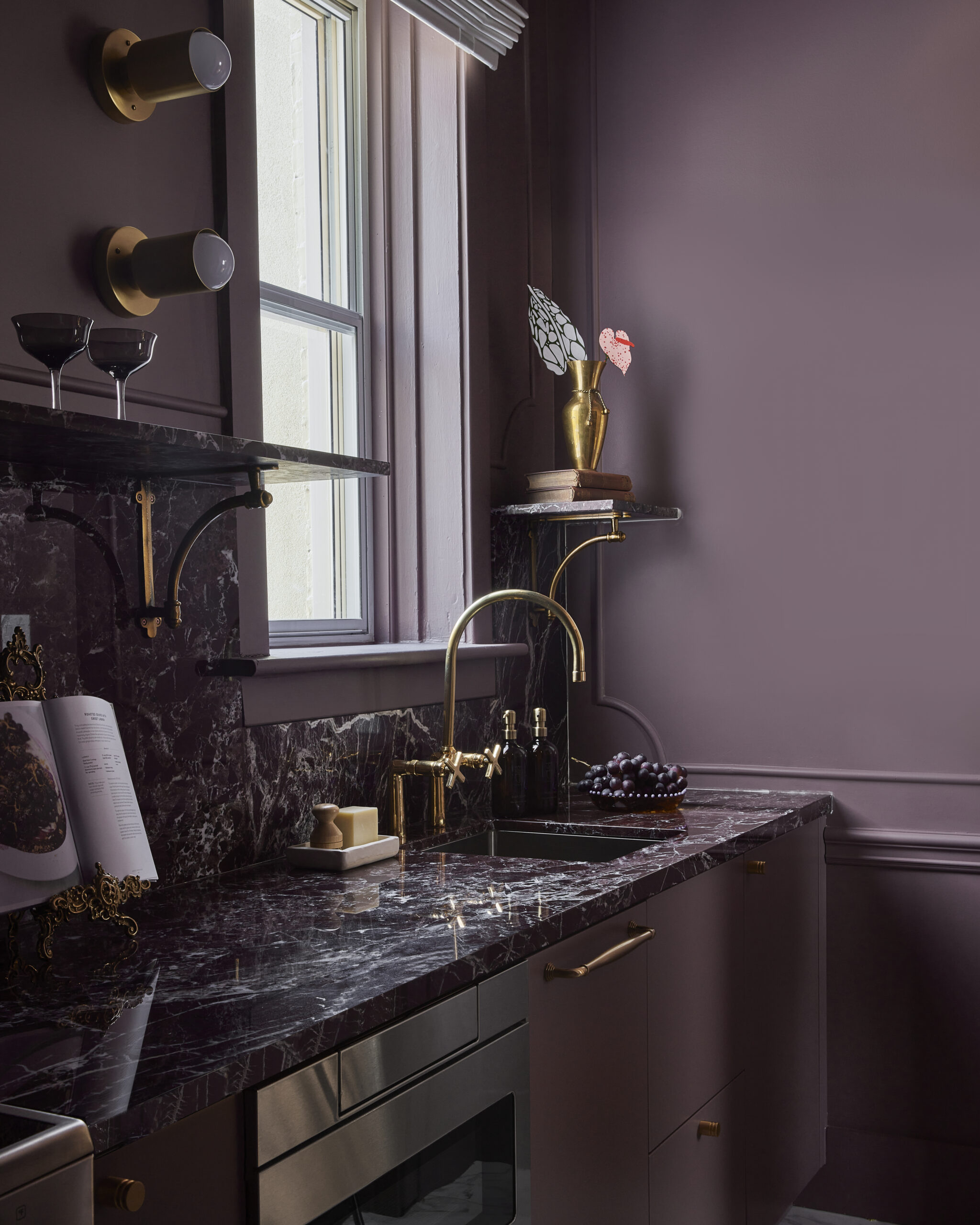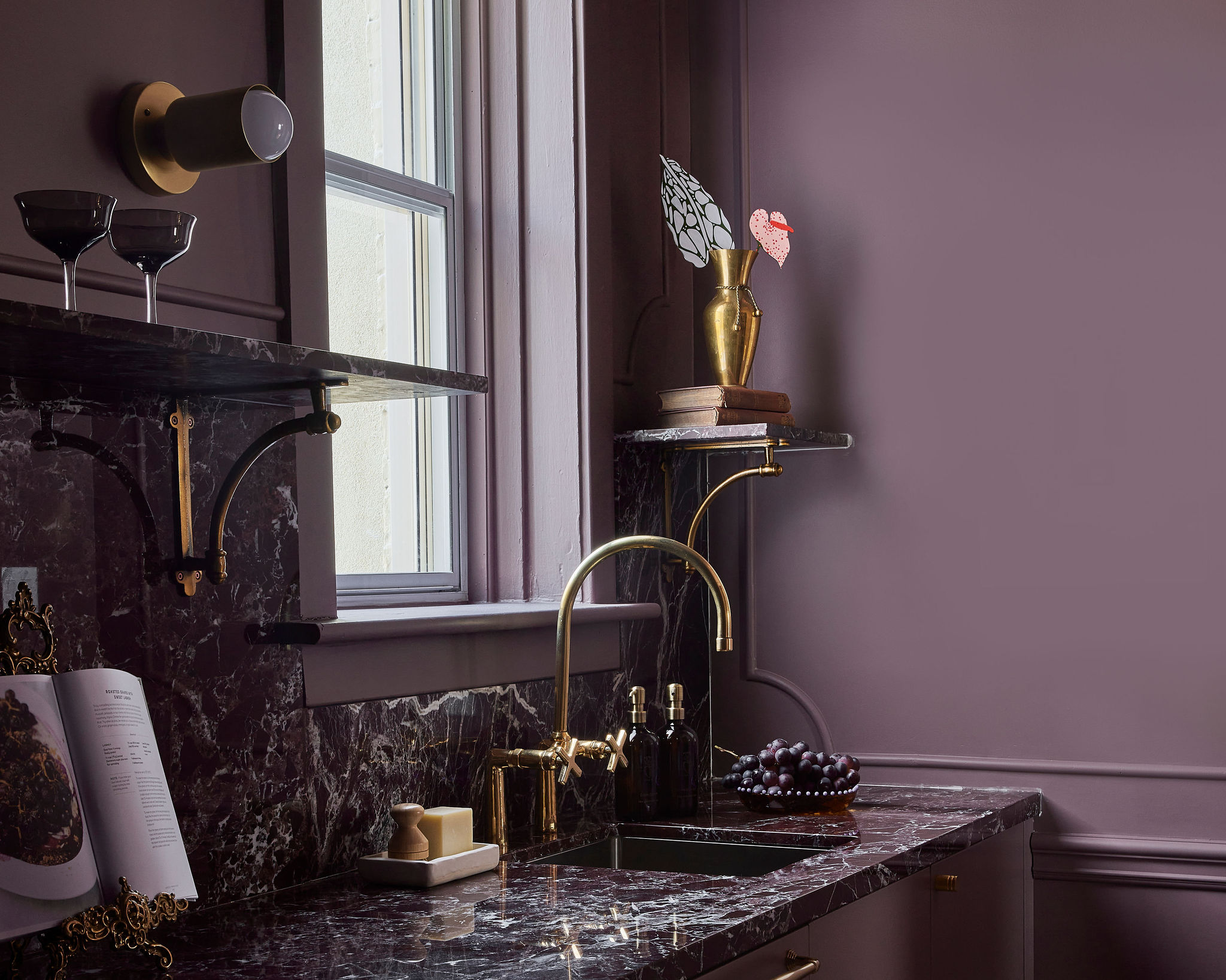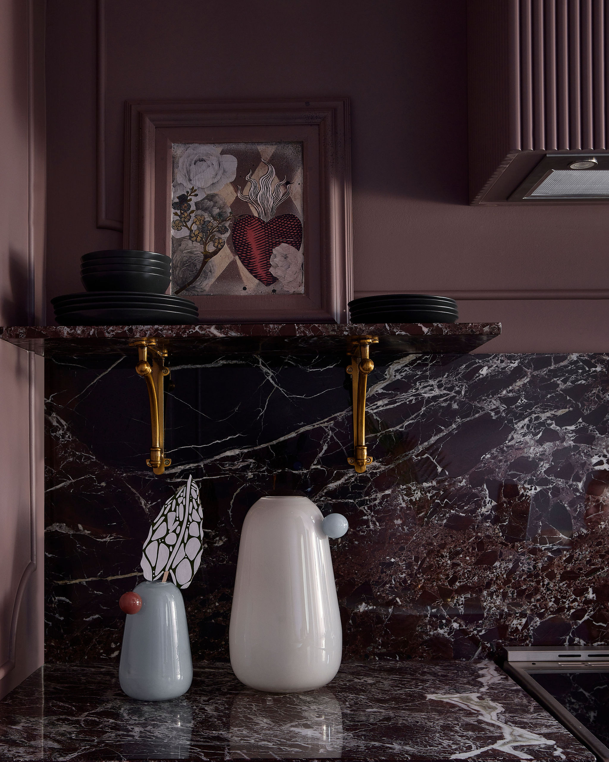 Indulge in the opulence of our romantic, chocolate-brown suite with moody purple undertones at Hotel Julie’s Flat 03.