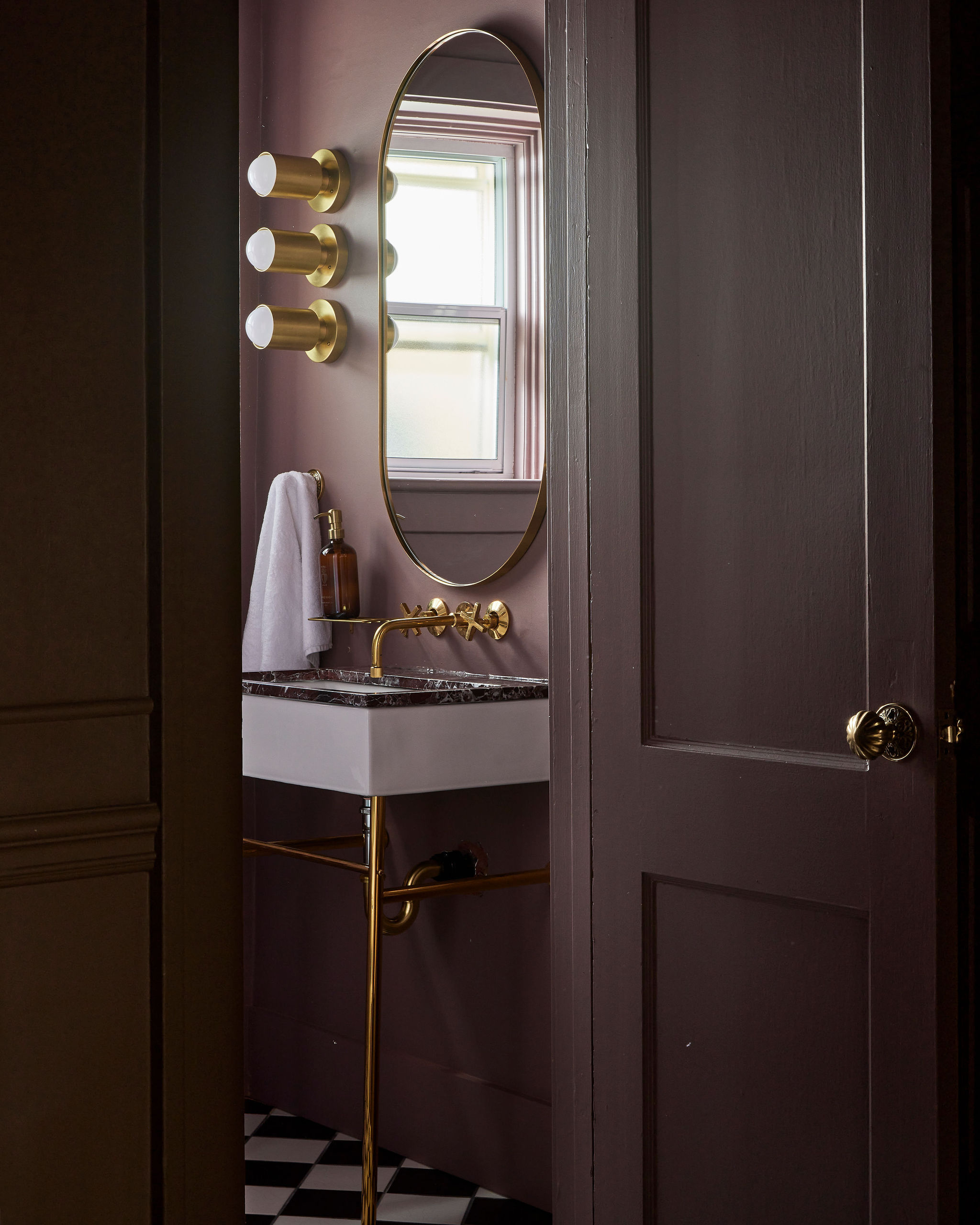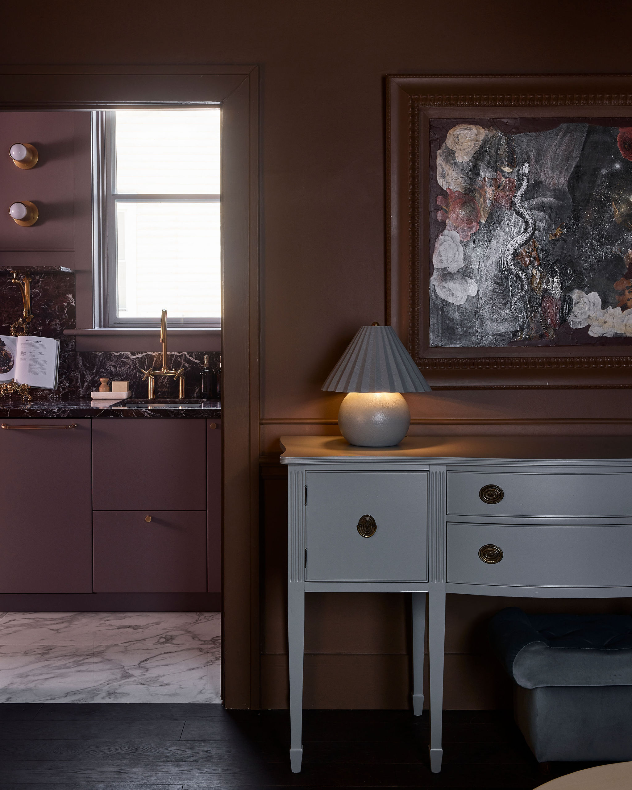 This Shakespearean-inspired haven boasts a separate living room, dining nook, and fully equipped kitchen, complemented by timeless reupholstered furniture and bespoke pieces from Pompous Fox Wood Co.