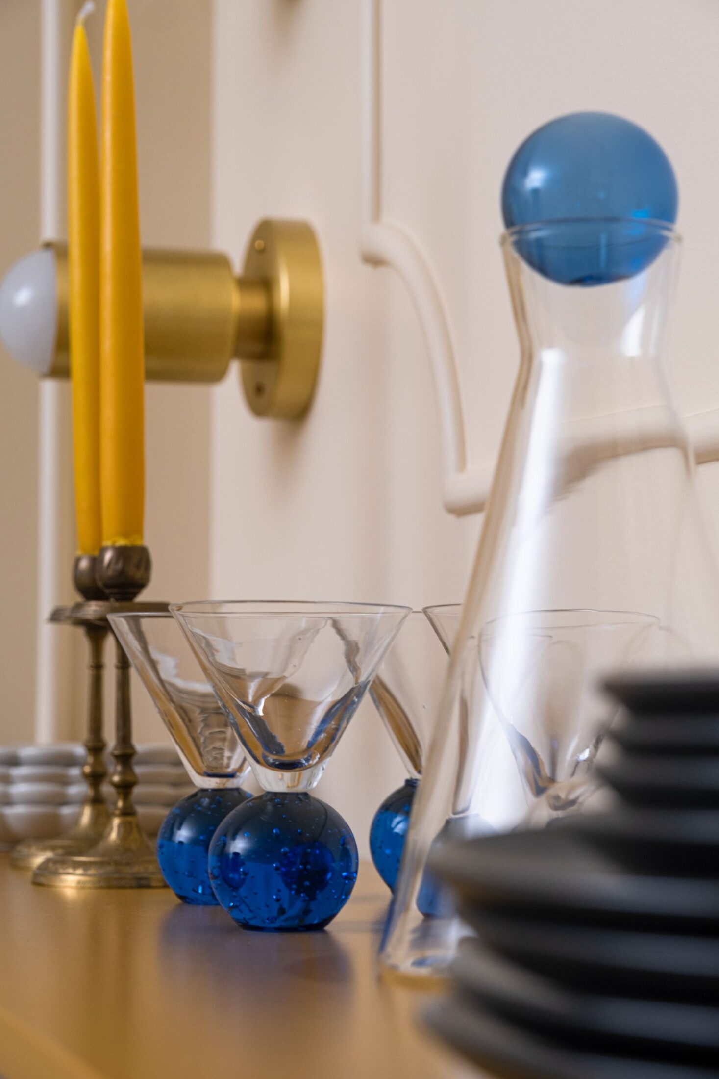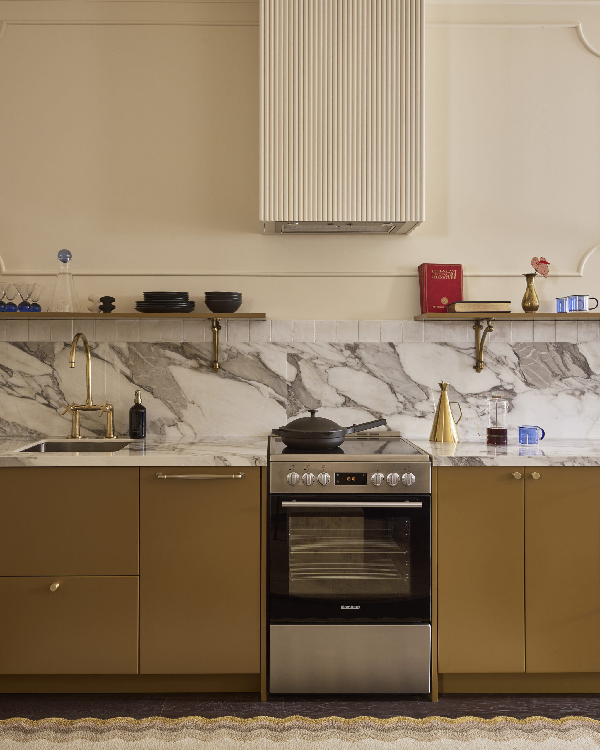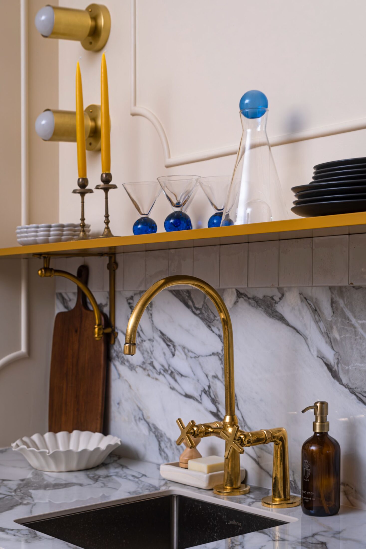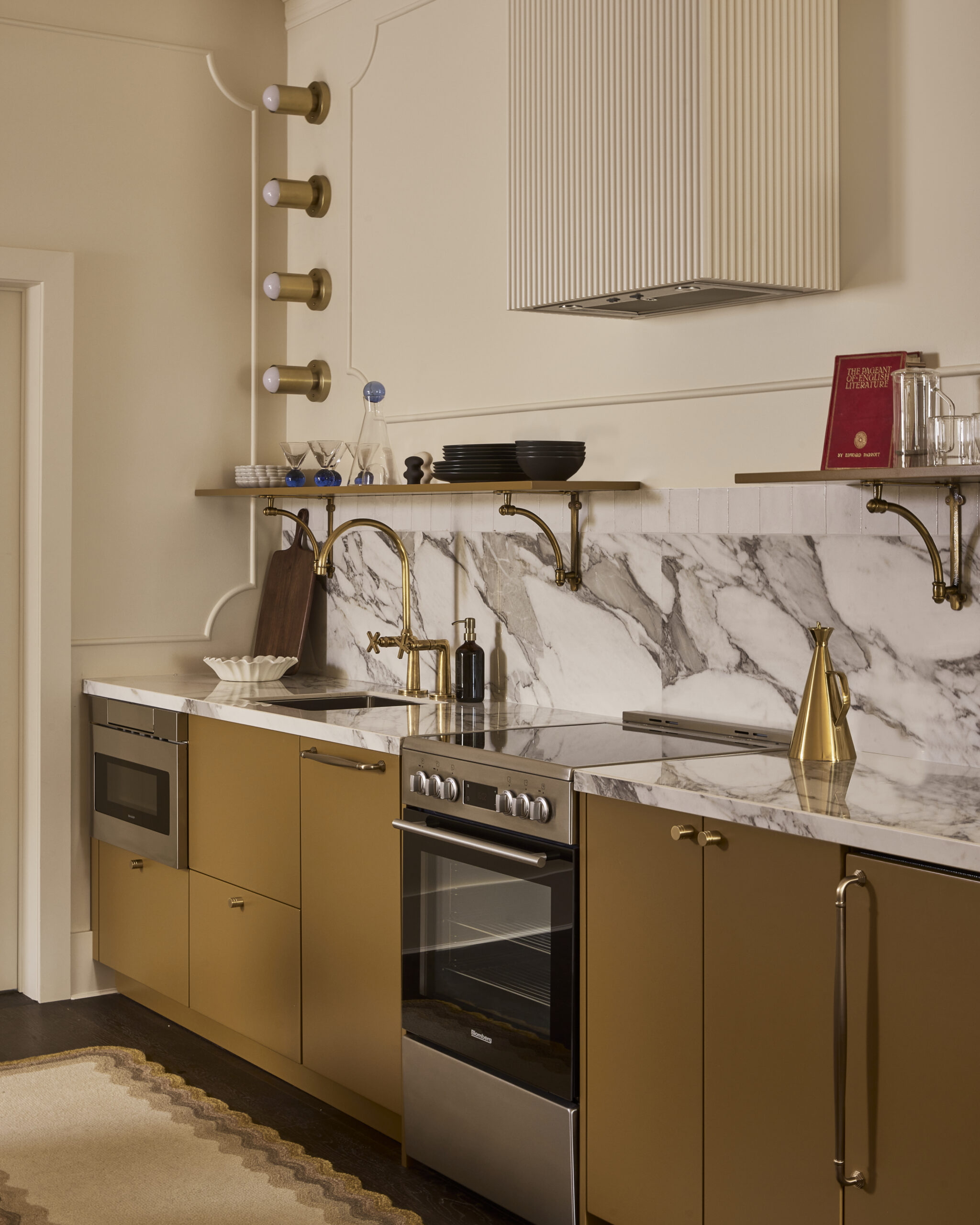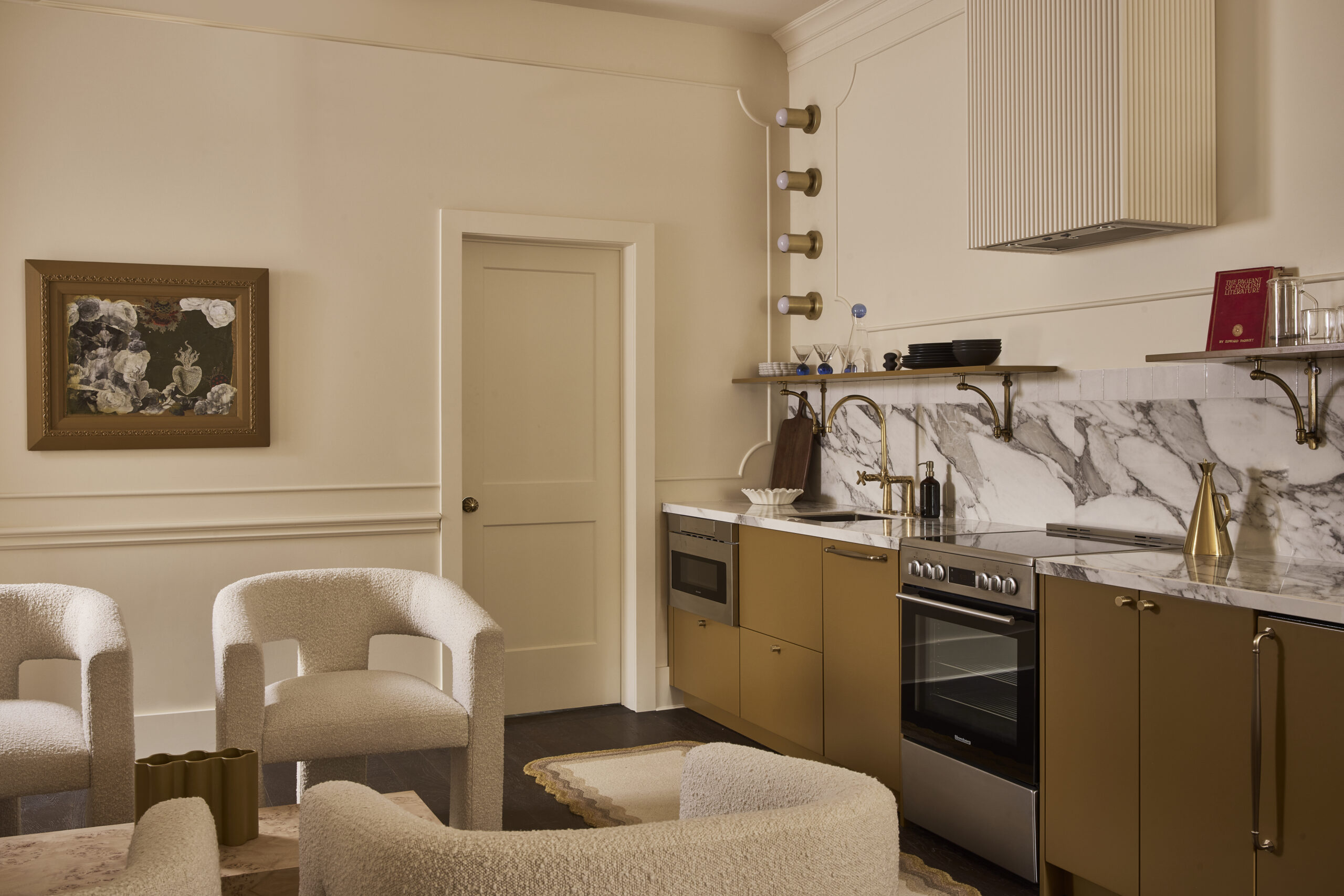 This open concept suite features a beautiful golden galley kitchen featuring high end built in appliances: a range, microwave, fridge, freezer and dishwasher. Stunning arabescato countertops accented with hand formed tiles- this open shelved kitchen is fully stocked with beautiful vintage glassware for all your celebratory sips.