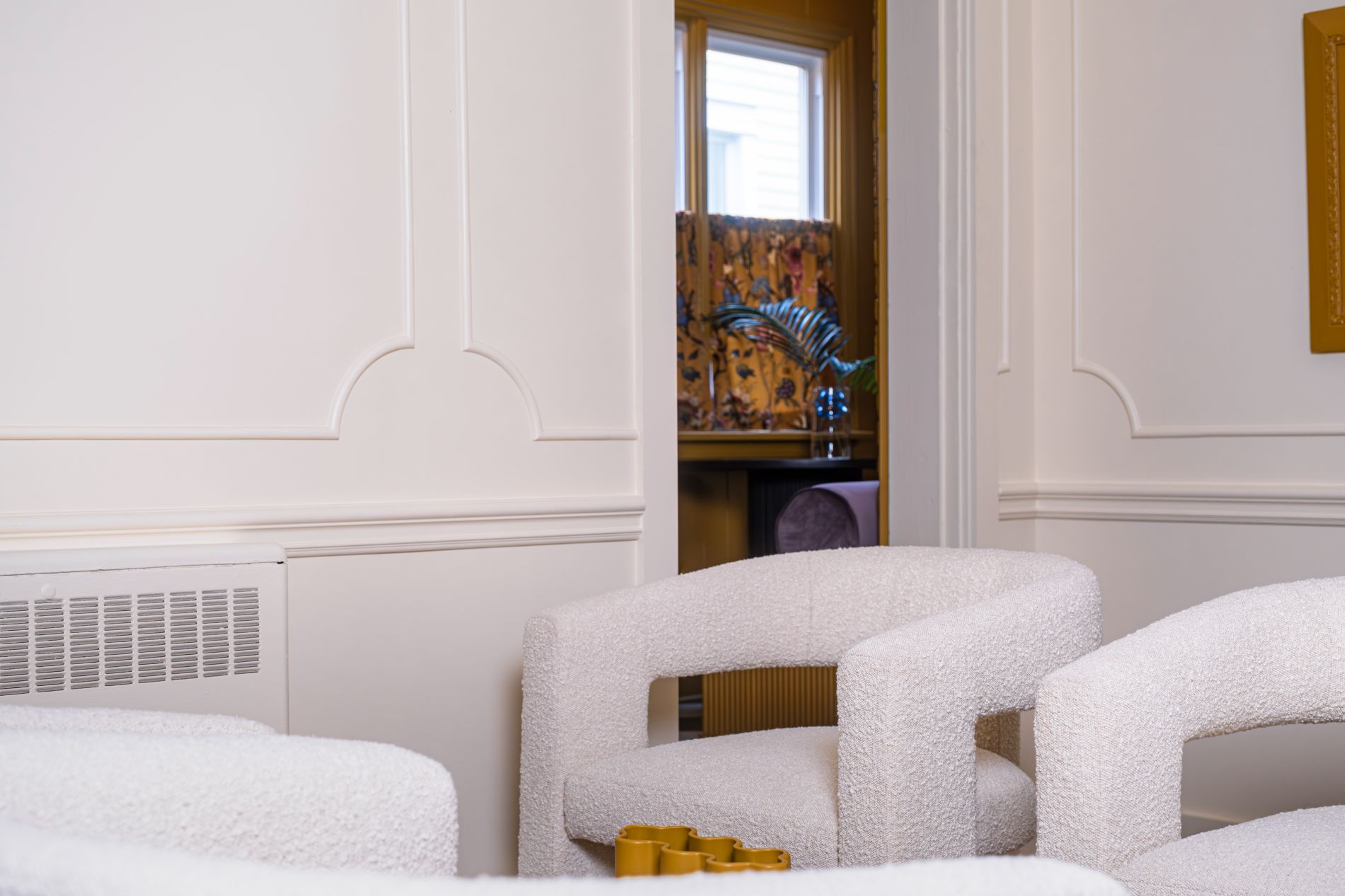 A comfortable and cozy seating area with room for four allows for this suite to be the communal hang out flat for group trips. Four beautiful and comfortable boucle lounge chairs pair perfectly with a custom burl coffee table designed by Pompous Fox.