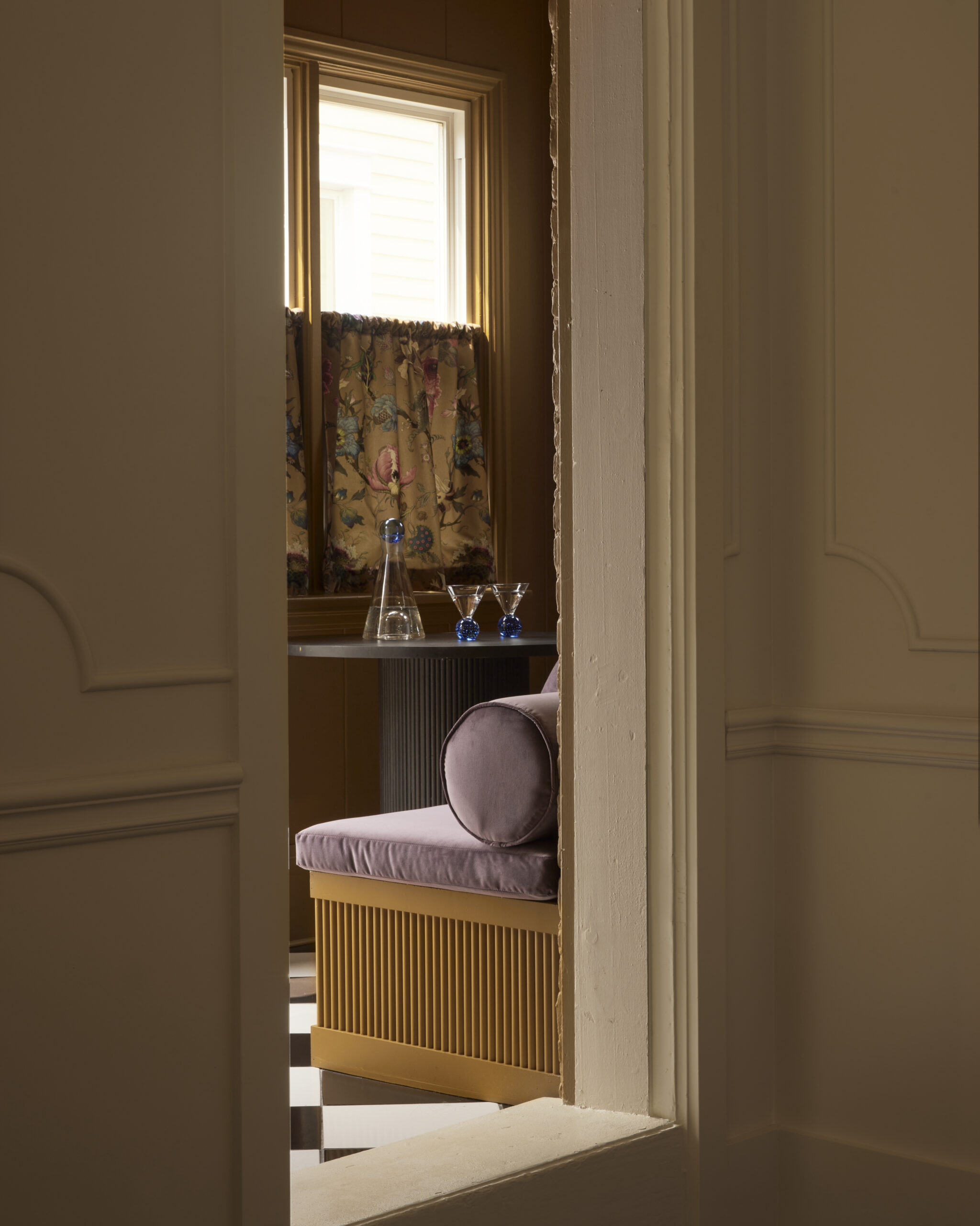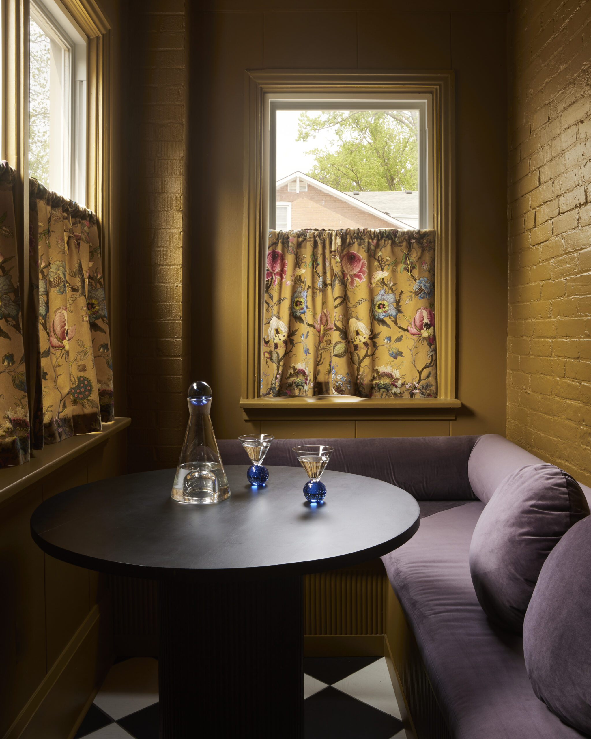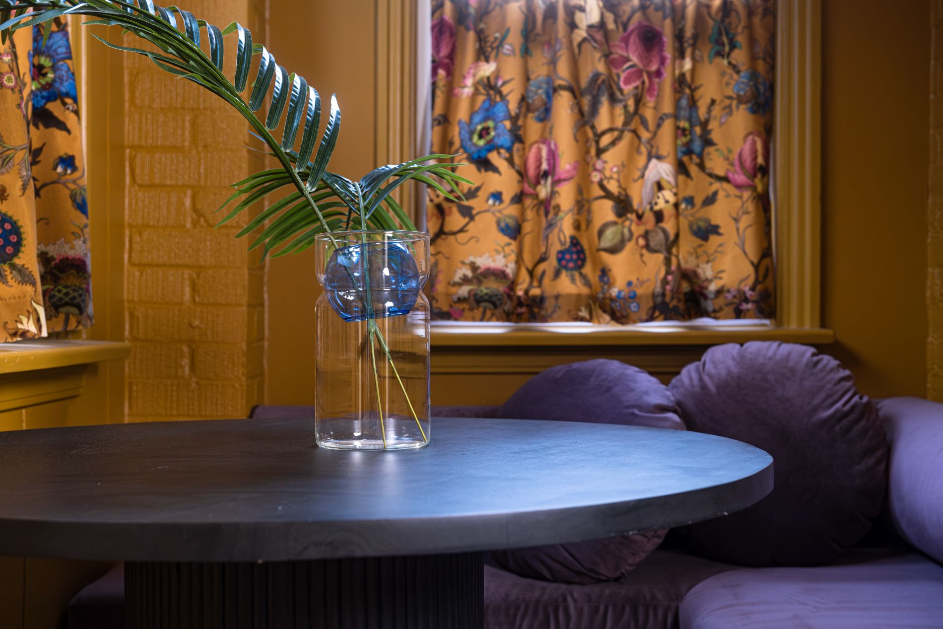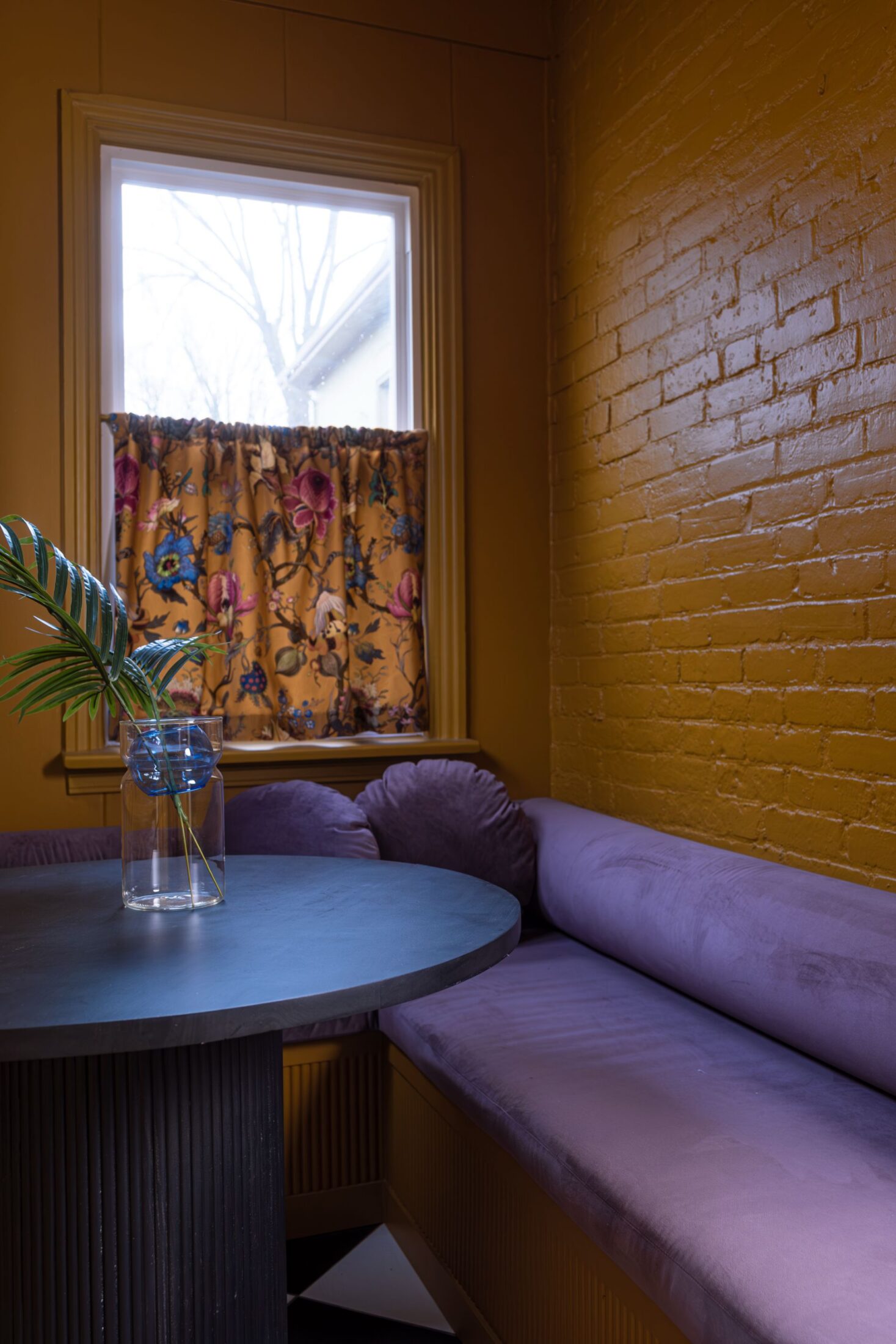 What makes this flat unique from most is that it features a quaint breakfast dining nook with beautiful amethyst velvet banquette seating and a bistro dining table. With privacy (and beauty) in mind—this flat also features designer velvet floral cafe curtains.