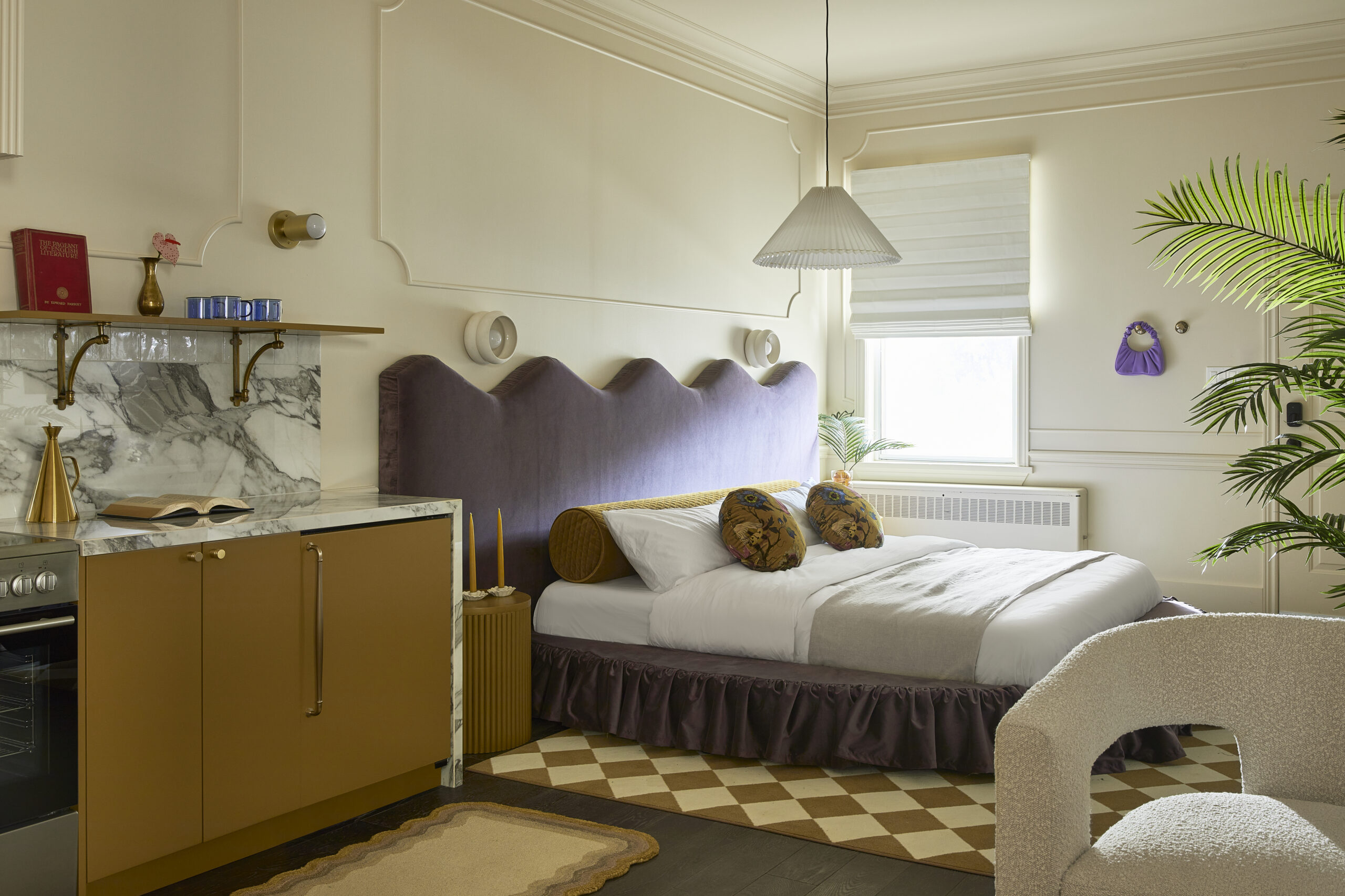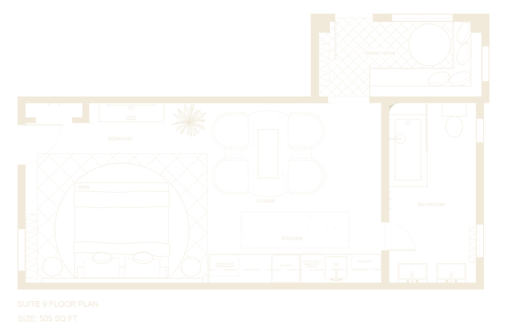 Flat 09 packs a punch with a unique and interesting feature—a round king size bed! Our signature custom wiggle headboard paired with a round bed base makes for an unforgettable experience.