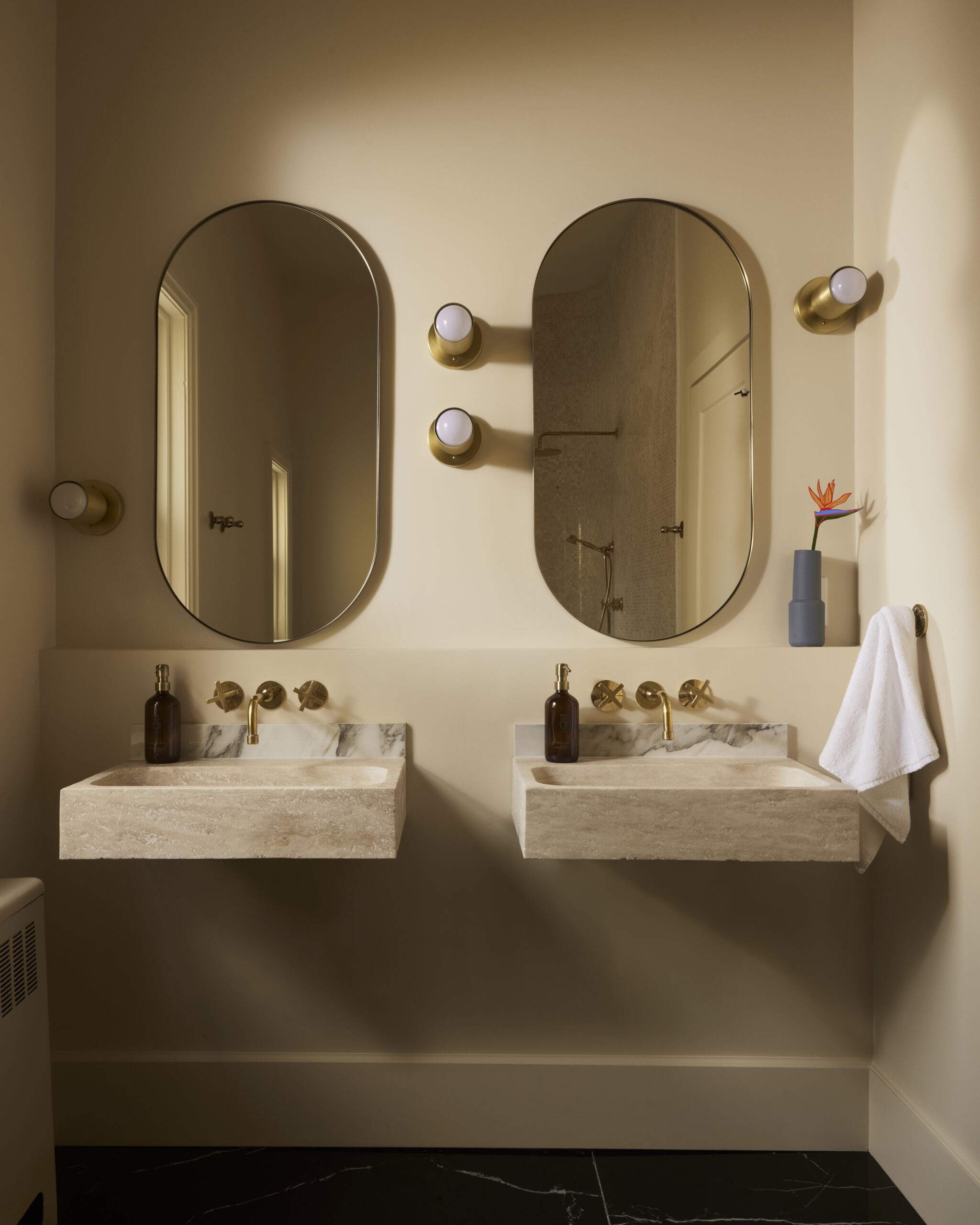 The washroom in this suite is one of our designer favourites. This bathroom features two side by side travertine floating vanities and a curved crema marfil mini check tub/shower. A bold nero marquina floor tile the room allowing all the beautiful textural elements to shine.